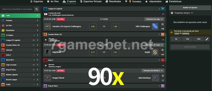 O 90x oferece uma grande seleção de opções de apostas em e-sports com probabilidades competitivas